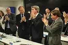 Le , il obtient l'investiture de l'Assemblée de Madrid grâce au soutien de 65 députés de son groupe et de Ciudadanos face aux 64 voix contre du PSOE et de Podemos[98]. Il devient alors le sixième président de la communauté de Madrid depuis la création de la communauté autonome en 1983[99],[100]. Lors de ses premières déclarations en tant que président élu, il dit ressentir un « authentique honneur et une énorme responsabilité » puis remarque qu'il « pourra commettre des erreurs, comme tout humain, mais qu'il s'emploiera au maximum »[101]. Le soir, il assiste depuis le siège du gouvernement régional à la réception de la coupe de la ligue Europa remportée, deux jours auparavant, par l'Atlético de Madrid[102]. Il est officiellement nommé président de la communauté de Madrid le lendemain, , par décret royal contresigné par le président du gouvernement Mariano Rajoy[103]. Il prend possession de ses fonctions le suivant[104], en présence de la nouvelle direction du PPM, de María Dolores de Cospedal, Soraya Sáenz de Santamaría et Fátima Báñez ainsi que des députées María Jesús Bonilla et Mar Blanco[105].