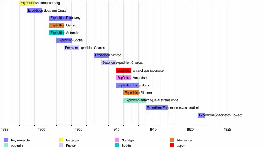- Le tableau n'inclut pas les nombreux voyages de pêche à la baleine qui eurent lieu au cours de cette période et les expéditions secondaires du type de Carl Chun entre 1898 et 1899, qui n'a pas franchi le cercle Antarctique[12]. L'expédition Cope entre 1920 et 1922, avortée faute de financement, est également exclue, bien que deux hommes débarquent d'un baleinier norvégien et passent un an dans la péninsule Antarctique[13].