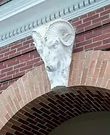 Un ægicrane sur une clef d'arc, Clayton School (1915) à Clayton, État de Washington, États-Unis.