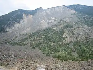 Le glissement de terrain a été causé par la présence de structures géologiques préexistantes (failles et zones de cisaillement) dans le versant sud-ouest de Johnson Ridge[13]. Les parties inférieures de la zone de rupture sont soutenues par des feuilles de felsite (qui peuvent avoir échoué en premier) tandis que les parties supérieures de la zone de rupture sont soutenues par des lits de roches vertes paléozoïques fortement plissés[14]. L'altération continue et l'activité tectonique ont affaibli la masse de la lame au point où elle avait atteint un équilibre limite. Johnson Peak avait aussi été le site d'un éboulement préhistorique de taille inférieure[15].