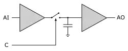 Lorsque le signal de commande ouvre l'interrupteur, le condensateur ne peut se décharger à travers le deuxième amplificateur, car celui-ci possède une impédance d'entrée infinie (du moins théoriquement). Le condensateur conserve ainsi sa charge électrique et la tension à ses bornes, ce qui maintient la tension AO en sortie constante quelle que soit la valeur de tension AI en entrée. Il s'agit de la phase de mémorisation.