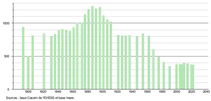 L'évolution du nombre d'habitants est connue à travers les recensements de la population effectués dans la commune depuis 1793. Pour les communes de moins de 10 000 habitants, une enquête de recensement portant sur toute la population est réalisée tous les cinq ans, les populations légales des années intermédiaires étant quant à elles estimées par interpolation ou extrapolation[27]. Pour la commune, le premier recensement exhaustif entrant dans le cadre du nouveau dispositif a été réalisé en 2004[28].