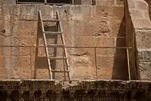 Faite de bois de cèdre, peut-être en provenance du Liban, cette échelle est mentionnée la première fois en 1757 mais figure déjà sur une gravure de 1728. Elle est restée au même emplacement depuis le XVIIIe siècle, hormis trois déplacements temporaires : en 1981, un homme essaye de la voler mais est immédiatement arrêté par la police israélienne ; en 1997, un farceur réussit à la cacher pendant plusieurs semaines, mais elle est retrouvée et remise à sa place ; en 2009, une équipe d’ouvriers doit la déplacer pour mettre un échafaudage afin de réparer le clocher[1].
