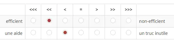 Un exemple de comparaison des propriétés statistiques respectives des échelles de Likert et sémantiques différentielles se trouve dans un article[5] traitant du Modèle d'acceptation de la technologie. Sous sa seconde forme, l'échelle servant à mesurer l'utilité perçue d'un système informatique oppose les termes suivants (traduction libre) :