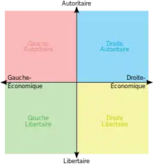 Un autre modèle est celui du libertarien David Nolan. Ce diagramme montre ce qu'il considère comme les « libertés économiques » (comme le niveau des impôts, le marché libre et la libre entreprise) sur l'axe des abscisses, et les « libertés individuelles » (liberté de circulation, laïcité, libre possession de son corps qui regroupe la légalisation des drogues, l'avortement, l'euthanasie, etc.) sur l'axe des ordonnées.