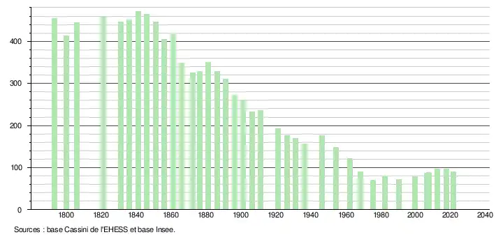 L'évolution du nombre d'habitants est connue à travers les recensements de la population effectués dans la commune depuis 1793. Pour les communes de moins de 10 000 habitants, une enquête de recensement portant sur toute la population est réalisée tous les cinq ans, les populations légales des années intermédiaires étant quant à elles estimées par interpolation ou extrapolation[20]. Pour la commune, le premier recensement exhaustif entrant dans le cadre du nouveau dispositif a été réalisé en 2007[21].