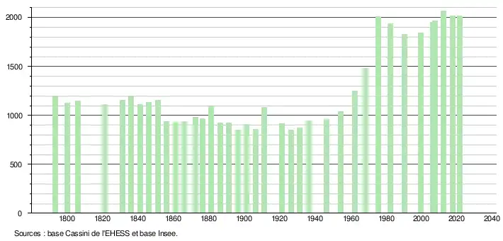 L'évolution du nombre d'habitants est connue à travers les recensements de la population effectués dans la commune depuis 1793. Pour les communes de moins de 10 000 habitants, une enquête de recensement portant sur toute la population est réalisée tous les cinq ans, les populations légales des années intermédiaires étant quant à elles estimées par interpolation ou extrapolation[20]. Pour la commune, le premier recensement exhaustif entrant dans le cadre du nouveau dispositif a été réalisé en 2007[21].