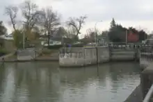 À l’occasion, si le débit du cours d’eau est suffisant, une écluse sans barrage permet de racheter un courant trop fort : à Buffalo, sur la rivière Niagara, celle de Black Rock (en)[14] contourne les vigoureux rapides du pont de la Paix à l’International plus au nord. Sur les trois-quarts du parcours de quelque deux milles nautiques, l’île est prolongée vers l’amont par des épis pour assurer un apport d’eau suffisant jusqu’à l’écluse. Le « rachat » de la chute moyenne de 5,2 pieds (±1,5 m) permet aux « petits » bâtiments d’accéder à Tonawanda à quelque 12 km de là à la rivière canalisée du même nom, puis, après moins de 40 km d’un plan d’eau à « l’étale », aux deux premières écluses du Canal Érié à Lockport.