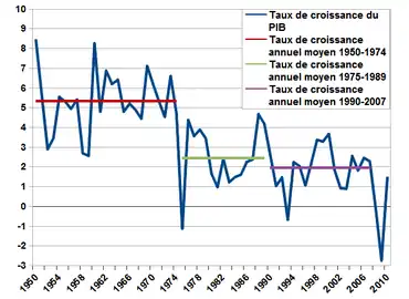 Entre 1946 et 1973, la France connaît une période de très forte croissance (en moyenne 5 % par an) que l’économiste Jean Fourastié a, a posteriori, qualifiée de « Trente Glorieuses ». Cette croissance est beaucoup plus élevée que la croissance économique de long terme de la France (cf. graphique) : de 5 % au lieu d'un peu plus de 2 % par an pour le PIB par habitant. Cette croissance économique exceptionnelle va permettre à la France, en retard dans les domaines de la technologie et de l'organisation de la production, et dont l'appareil de production avait été fortement détruit par la guerre, de rattraper une grande partie de son retard sur les États-Unis: si en 1950, le revenu moyen d’un Français représente à peine plus de la moitié de celui d’un habitant des États-Unis (55 %), il en atteint les quatre cinquièmes en 1973.