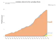 En 2014, la Jordanie importe encore 97 % de ses besoins énergétiques[13]. Elle produit un peu d'énergie hydroélectrique (par exemple aux barrages de Wadi Al-Mujib ou d'Al-Wehda).
