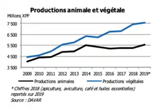 L’autosuffisance alimentaire s’inscrit comme un enjeu majeur pour le territoire dont le taux de couverture s’établit à 47 %. La production agricole commercialisée s’élève à 13,2 milliards francs Pacifique (110 millions d'euros) en 2019.