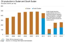 En 2013, la production et l'exportation du pétrole, principale ressource du pays, représente plus de 90 % du budget de l’État (98 % en 2001). La production est, en 2012, de 380 000 barils par jour, en baisse de 20 000 barils depuis la séparation du Sud en raison d’un manque de techniciens qualifiés. L'exportation se fait via des oléoducs passant par le Soudan. Il est envisagé d'en construire passant par le Kenya ou Djibouti si la tension avec le Soudan persiste. Celle-ci a causé un arrêt de la production, à la suite de combats en 2012[4], conduisant à une chute de moitié du PIB sud-soudanais.
