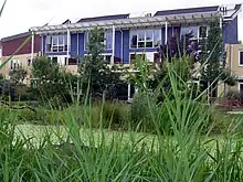 - Le quartier de Kronsberg à Hanovre : Première phase de construction entre 1997 et 2000. Aujourd'hui 7300 personnes vivent à Kronsberg dans 2600 appartements, 150 copropriétés et environ 400 logements individuels[32]. Ce projet a été intégré au programme de développement Européen dans le cadre de l'exposition universelle EXPO 2000. Un fond spécial a été créé de façon à financer les infrastructures du nouveau quartier, la municipalité a accepté de dépenser la majeure partie des revenus issus de la vente des terrains à l'aménagement de la zone. Cela a permis de bénéficier d'infrastructures de grandes qualités dès les premières phases du projet (écoles, zones résidentielles, jardins, maison de quartier "KroKuS") ainsi que des éléments paysagers à forte identité (zones reboisées, reliefs artificiels, place centrale, système de retenue des eaux de pluie)[33]. Toutes les habitations sont des logements de basses énergies qui ne consomment pas plus de 55 kWh par m2 par an pour le chauffage. L'énergie éolienne est la principale source d'énergie renouvelable utilisée à Kronsberg ce qui en fait un exemple type du quartier à haute qualité environnementale cependant, il ne répond pas totalement à la définition d'un écoquartier en termes de mixités et de vie de quartier.