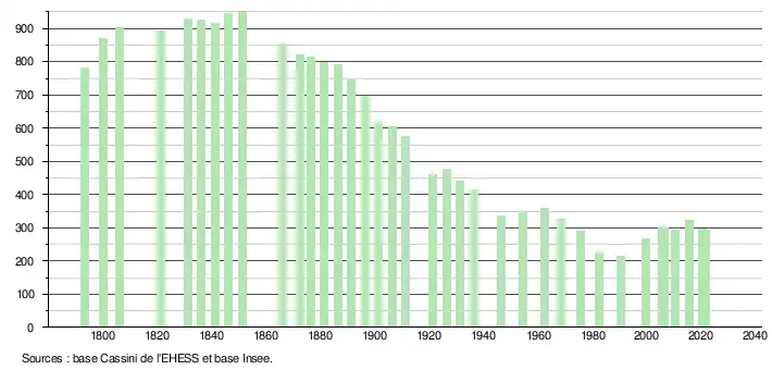 L'évolution du nombre d'habitants est connue à travers les recensements de la population effectués dans la commune depuis 1793. Pour les communes de moins de 10 000 habitants, une enquête de recensement portant sur toute la population est réalisée tous les cinq ans, les populations légales des années intermédiaires étant quant à elles estimées par interpolation ou extrapolation[23]. Pour la commune, le premier recensement exhaustif entrant dans le cadre du nouveau dispositif a été réalisé en 2005[24].