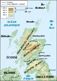 L'Écosse (en anglais et en scots : Scotland ; en gaélique écossais : Alba, /ˈal̪ˠapə/ ) est une nation constitutive du Royaume-Uni. Couvrant le tiers nord de l'île de Grande-Bretagne, l'Écosse continentale partage une frontière de 154 km avec l'Angleterre au sud, et est entourée par l'océan Atlantique au nord et à l'ouest, par la mer du Nord au nord-est et est, et par la mer d'Irlande au sud-ouest. Elle contient également plus de 790 îles, principalement dans les archipels des Hébrides et des Îles nordiques. La majeure partie de la population (dont la capitale Édimbourg) vit dans la ceinture centrale, qui correspond à la plaine située dans les Basses terres, entre les Hautes terres et les Hautes terres du Sud.