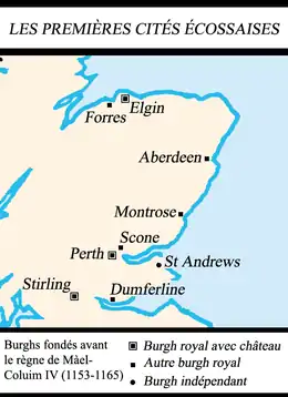 L’Écosse d’avant David Ier ne possède pas réellement de ville, bien que des concentrations de population supérieures à la moyenne existent autour des grands monastères, comme à Dunkeld et à Saint Andrews, ou autour des grandes fortifications. L’Écosse, Lothian mis à part, est constituée de hameaux dispersés, et n’a pas de villages constitués autour d’un noyau comme sur le reste du continent européen. David Ier établit les premiers burghs d’Écosse, d’abord dans le Lothian, zone du moyen anglais. David Ier recopie presque mot pour mot les chartes et les Leges Burgorum (règles définissant tous les aspects de la vie et du travail dans un bourg) des coutumes anglaises de Newcastle upon Tyne[42]. Les premiers burghs sont flamands, anglais, français, et germains plutôt qu’écossais gaéliques. Le vocabulaire des burghs est entièrement composé de termes français et germaniques[43]. Les conseils régissant chaque burgh ainsi appelés lie doussane, la douzaine[44].