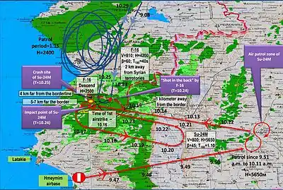 Les versions russe et turque des circonstances de cet incident divergent. Les faits en concordances sont les suivants. Le au matin, une paire de Su-24M de la 6980e base aérienne de la Garde de Shagol-Tcheliabinsk  sur les 24 en Syrie identifiés à l'époque  a décollé de la base aérienne de Hmeimim, située sur l'aéroport international de Lattaquié. Chacun d'eux était armé de 4 bombes à fragmentation OFAB-250-270 de 268 kg[167]. Ils prennent pour cible des positions de la « 1re division côtière », une formation de rebelles turkmènes ayant rejoint l'Armée syrienne libre[168] sur le djebel Zahiya au nord de Lattaquié et à cinq kilomètres de la frontière turque. Une paire de F-16C en patrouille du 182 Filo Atmaca (Escadron Faucon), venant de la base aérienne de Diyarbakır, abat ensuite l'ailier de la patrouille (code 19, no de série 0715323) à la frontière entre la Syrie et la Turquie par le tir au-delà de la portée visuelle d'un missile air-air AIM-120 AMRAAM[76].