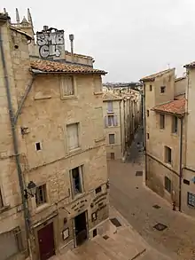 Au milieu du XIIe siècle, une première enceinte de taille réduite protège la ville. À la fin du XIIIe siècle, la ville s'étant beaucoup étendue, on décide la construction de l'enceinte qui marque encore de nos jours le cœur de la ville. Bien que très ancienne, l'enceinte survit à tous les événements que la ville traverse au cours de son histoire. Elle ne sera démantelée, progressivement, qu'à partir du XVIIe siècle. La ville médiévale ne se limita cependant pas à l'écusson, des faubourgs importants se développant aux XIIIe siècle et XIVe siècle, détruits par les guerres, et développés à nouveau à partir du XVIIe siècle[2]. La majorité des rues de l'Écusson sont des rues d'origine médiévale : étroites et tournantes. Une grande partie du bâti est également d'origine médiévale, modifié principalement aux XVIIe siècle et XVIIIe siècle.
