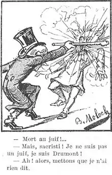 Édouard Drumont publie ensuite La France Juive devant l'opinion (1886), La Fin d'un monde (1889), La Dernière Bataille (1890), Le Testament d'un antisémite (1891) et Le Secret de Fourmies (1892). En 1890, Drumont fonde la Ligue nationale antisémitique de France. Il critique le cosmopolitisme de ce qu'il appelle la race juive, ce qui s'oppose pour lui au nationalisme fort qu'il défend. Drumont devient alors l'antisémite le plus célèbre de France. Son succès tient en partie à ce qu'il puise à l'ensemble des courants antisémites de l'époque, de l'antisémitisme anticapitaliste de la gauche à l'antisémitisme traditionnel catholique en passant par le racisme biologique, pour en tirer un système d'explication universelle où le Juif devient le responsable de tous les maux[7]. Catholique et royaliste, il se dit également pendant un temps socialiste et multiplie les contacts dans les partis de gauche[8].