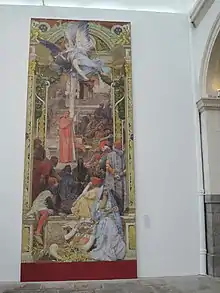 - La manufacture des Gobelins lui a commandé un ensemble de modèles retraçant l’histoire de la Bretagne pour des tapisseries qui décoraient jusqu'en 1994 la Grande Chambre du palais du Parlement de Bretagne à Rennes. Les six cartons peints furent présentés au Salon de 1907[11]. Les tapisseries, endommagées dans l'incendie de 1994, ont été détruites en 1997 dans l'incendie de l'atelier de Montrouge où elles étaient en cours de restauration. L'un des six cartons, Le mariage d'Anne de Bretagne, a été réinstallé au Palais de justice en 2017[12],[13].