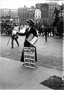 C’est pendant la période édouardienne que la campagne pour le droit de vote des femmes atteint son niveau le plus élevé. En 1903, frustrée par le manque de progrès à ce sujet malgré quarante ans de campagnes légalistes, Emmeline Pankhurst lance une nouvelle organisation, la Women's Social and Political Union, dont le mot d'ordre est « Des actions, pas de mots ». Elle se lance dans une campagne d'action directe contre la propriété, sans user de violence envers autrui. Des boites à lettres sont brûlées, des vitrines cassées, des œuvres d'art détruites, et autour de mille suffragettes sont emprisonnées. En prison elles recourent à la grève de la faim, et le gouvernement répond par un programme d'alimentation forcée et violent qui fait la une de tous les journaux.