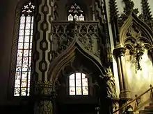 Le chœur a une forme proche du carré, à qui mène l’escalier de 10 marches. Les murs plus longues sont couverts de tracerie dans la forme des arcades. Entre les arcades, on peut voir la polychromie : la croix entrelacée de la couronne d’épines et les boutons de fleurs, probablement la rose de Luther.