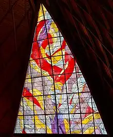 D'architecture typique des années 1960, elle est construite principalement en béton et bois lamellé-collé.