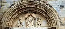 Le tympan roman du portail ouest représente la Vierge assise tenant l'enfant Jésus nimbé sous un dais de style byzantin porté par des colonnettes sculptées. On remarque au-dessus de la Vierge la Main céleste. À gauche de la Vierge se trouve un ange et à sa droite le prophète Isaïe, tenant une palme de la main gauche et un phylactère de la main droite. L'ensemble est encadré de voussures finement décorées.