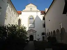 Sur le côté ouest de la place de Malte se trouve une façade gothique en pierre, composée de deux tours abaissées plus tard avec un portique entre elles. On peut traverser le portique dans la cour qui se trouve approximativement à la place du temple roman original. Sur le côté est de la cour se trouve l'entrée de l'église baroque, créée par des modifications graduelles du temple gothique initialement prévu.
