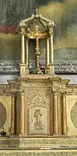L’autel est dit de style tombeau. Les différents marbres utilisés viennent des carrières de Mayenne. Les colonnes sont ioniques et corinthiennes. (Baroque) Les dessins en relief de végétaux sont typiques du XVIIIe siècle. On trouve les deux thèmes du blé et de la vigne. Noter le magnifique présentoir central. Les deux autels qui flanquent l'arc central sont de la même période.