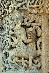 Sur chacune des petites faces de la corbeille on voit un homme sur le dos d'un lion. La face principale et le tailloir du chapiteau foisonnent avec des rinceaux et lianes qui couvrent tout l'espace disponible.