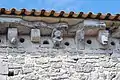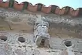 À l'extérieur de l'abside, entre les modillons, sculptés avec des gueules d'animaux et têtes d'hommes, qui portent la corniche, des trous ronds sont forés, comme dans le clocher de l'église Saint-Georges de Montagne et dans la corniche de Saint-Front de Périgueux.