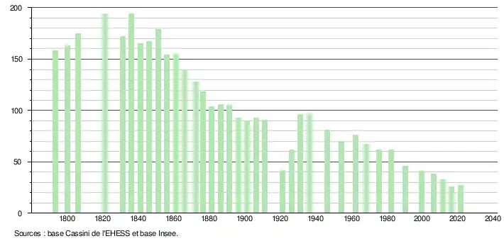 L'évolution du nombre d'habitants est connue à travers les recensements de la population effectués dans la commune depuis 1793. Pour les communes de moins de 10 000 habitants, une enquête de recensement portant sur toute la population est réalisée tous les cinq ans, les populations légales des années intermédiaires étant quant à elles estimées par interpolation ou extrapolation[29]. Pour la commune, le premier recensement exhaustif entrant dans le cadre du nouveau dispositif a été réalisé en 2006[30].