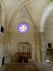 Le chœur et sa chapelle latérale sud n'ont pas bénéficié de la restitution de la polychromie architecturale. Mais si la chapelle a traversé les siècles sans trop de dégradations, les chapiteaux du chœur ont subi des dégradations à l'instar de ceux de la croisée du transept et du clocher. Leur sculpture est difficilement lisible. Il semble qu'ils aient seulement été sculptés de feuilles simples. Dans son état actuel, la travée n'évoque guère un sanctuaire, mais plutôt le chevet du bas-côté nord d'une église d'importance moyenne. En effet, il y a un mur au nord, mais un doubleau au sud, et depuis le retrait du retable du maître-autel, la baie du chevet n'a pas été reconstituée, sans doute faute de connaître sa forme concrète. On y trouve toujours l'oculus sans remplage que l'on avait aménagé lors de la pose du retable, qui aurait obturé la baie primitive. Une niche d'autel en anse de panier, de faible profondeur, est prise dans l'épaisseur du mur. Dans ce contexte, on peut évoquer le mur du nord, qui a également été remanié. On y trouve la porte de la sacristie à droite, et l'ébrasement d'une fenêtre bouchée au milieu. Entièrement inscrite sous la lunette de la voûte, elle était délimitée supérieurement par le formeret[14].