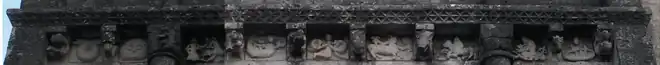 Les corniches à modillons semblent représenter le combat contre les vices. La corniche du milieu comporte des métopes entre les modillons représentant une sirène, une femme mordue aux seins par deux serpents, un centaure, un chevalier, des lutteurs, un lion enfourché par un homme, ...