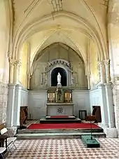 Le chœur et la chapelle formant le croisillon nord sont appareillés en pierre de taille, à l'instar de la première travée de la nef et du clocher. Les deux travées du chœur sont nettement barlongues, et de faible profondeur, ce que l'on voit bien au sud, où la niche d'autel à l'est du clocher, pourtant faiblement saillante, dissimule le piédroit gauche de la baie méridionale du chœur. La fenêtre est une lancette simple en plein cintre, sans décoration, entourée seulement d'un ébrasement. Le mur se termine par une corniche, qui est au profil d'une plate-bande, d'une profonde gorge, et d'un tore proéminent. Celui-ci s'appuie sur des modillons, qui adoptent un profil assez similaire, mais qui n'est pas toujours rigoureusement le même. Certains médaillons sont échancrés du bas vers le haut, et affichent ainsi une arcature en plein cintre, ou une billette s'insère entre les deux segments du modillon. Un seul modillon représente une rosace. Au nord, la corniche repose, pour l'essentiel, sur des corbeaux au profil d'une baguette et d'un méplat. Seulement les deux derniers sont pourvus d'un décor sculpté géométrique simple. La fenêtre est du même type qu'au sud. Chacun des deux angles du chevet est épaulé par deux contreforts plats orthogonaux, du même type que ceux de la façade et du clocher, ce qui souligne la grande homogénéité de l'édifice. La fenêtre du chevet, déjà bouchée lors du passage de Louis Graves vers 1840, est la seule de l'église qui a bénéficié d'une décoration. En plein cintre comme les autres à ce niveau d'élévation, elle est surmontée d'une archivolte profilée d'un tore dégagé, qui retombe sur les chapiteaux de crochets de deux fines colonnettes en délit. Les fûts sont bagués à mi-hauteur. D'une facture tout à fait différente sont les deux fenêtres qui éclairent la chapelle, au nord et à l'est. Par leurs délicats réseaux de deux lancettes à têtes trilobées, surmontées d'un soufflet également trilobé entre deux étroits écoinçons ajourés, et leur modénature prismatique, elles sont emblématiques du style flamboyant. Une gorge et une étroite moulure concave les entoure, et à leur seuil, un larmier passe autour de la chapelle au niveau de la limite des allèges. Un autre élément de scansion horizontal est la plinthe moulurée, qui masque la retraite du mur après les premières assises. Un unique contrefort oblique, qui s'amortit par un glacis formant larmier, épaule chacun des deux angles. Cette position des contreforts est usuelle à la fin de la période gothique[4],[3].