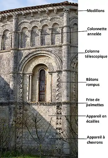 L’ensemble du décor est rythmé par de longues colonnes engagées cantonnant les pans de l’abside et, jusqu’à la corniche supérieure, aucun espace n’est laissé vide. Sur le chevet de l’église s’est déployé un vocabulaire ornemental fait d’éléments géométriques ou de végétaux stylisés dont les musées de la région conservent de nombreux exemples.