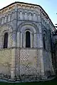 L’intérieur des grandes arcatures du premier niveau est le domaine de la stéréotomie (art de tailler et disposer les pierres) avec des assises en zigzags, obliques ou en écailles de poisson qui semblent héritées de l’Antiquité tardive. À mi-hauteur, une assise décorée de marguerites court sur toute la longueur du chevet.