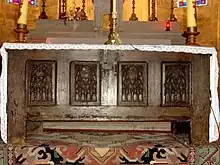 Trois bâtons de confrérie : saint Vincent, la Vierge, saint Joseph.
