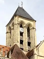 La tour atteint une hauteur de 34 m sans le toit à la hache couvert d'ardoise, qui mesure 8 m de haut[55]. L'unique étage de beffroi s'appuie sur un étage intermédiaire, qui est aveugle et en grande partie caché par les toitures. Ce serait un ancien étage de baies subsistant du clocher roman. Sa fonction est aujourd'hui d'éviter que les baies du clocher ne soient obturées par les toitures. Il se termine par un cordon de têtes de clous ou de pointes-de-diamant. Par sa physionomie générale, le clocher de Vétheuil s'inscrit dans la lignée des clochers gothiques du Vexin français, qui a été inaugurée par le clocher central de Nucourt, et dont Auvers-sur-Oise est le représentant le plus célèbre, mais pas le plus abouti. D'autres exemples sont Le Bellay-en-Vexin, Champagne-sur-Oise, Cléry-en-Vexin, Grisy-les-Plâtres et Jouy-le-Comte. Selon un procédé déjà utilisé à la période romane tardive, les contreforts de l'étage de beffroi sont souvent remplacés par des colonnettes, ce qui n'est pas le cas à Vétheuil, tout comme à Jouy-le-Comte et au Bellay, où apparaissent en revanche des clochetons flamboyants. Les contreforts sont plats et assez discrets. Les angles entre deux contreforts sont occupés par une colonnette appareillée à chapiteau, dont le tailloir est une tablette moulurée, qui est partagée par les contreforts et les chapiteaux des baies abat-son. Les colonnettes d'angle sont presque systématiques sur les clochers gothiques de la région, et ne manquent guère qu'à Jouy-le-Comte. Chaque face du clocher est ajourée de deux baies en tiers-point gémelées, qui sont élevées et bien proportionnées, et confèrent au clocher une certaine élégance et légèreté. Les baies s'ouvrent entre six colonnettes appareillées aux chapiteaux de crochets, et possèdent une triple archivolte torique, qui est surmonté d'un cordon de feuillages. Les deux cordons des deux baies contigües retombent sur trois chimères saillantes, comme au Bellay-en-Vexin. Comme particularité, les baies du clocher sont également flanquées de colonnettes à chapiteaux vers l'intérieur, ce qui est rare, et les triples archivoltes au-dessus des baies d'un clocher sont également rares. En ce qui concerne la corniche moulurée, elle est certainement contemporaine du toit. Rien ne permet d'affirmer que la construction d'une flèche en pierre était initialement projetée, car dans ce cas, des trompes devraient exister dans chaque angle, à l'intérieur, et les clochers gothiques du Vexin sont généralement coiffés d'une bâtière. La fin abrupte des contreforts montre néanmoins qu'une autre forme de couverture devait être prévue au XIIIe siècle[8],[56],[57].
