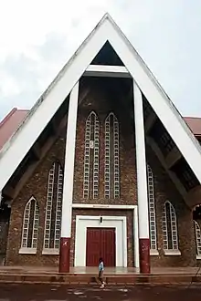 - Façade: Elle rappelle vaguement celle de la cathédrale Notre-Dame-des-Victoires de Yaoundé, beaucoup plus monumentale de 5 000 places. Elle se distingue de la précédente par une double toiture en quinconce de tuiles vertes. La première sert d'auvent soutenu par 4 colonnes (narthex) pour la porte principale de l'église et la seconde prolongée et soutenue par un arc-boutant de part et d'autre de la façade couvre la nef.
