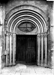 À la suite de la construction de la nef Sud, la porte d’entrée de l’église qui se trouvait en façade ouest est démontée et reconstruite en façade sud. Ainsi l’entrée qui se faisait par l’actuel cloître à l’ouest se fait désormais par la place de l’église au sud.