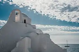 Cette église byzantine-cycladique pittoresque, blanchie à la chaux et dépouillée d’ornementation, est typique de l'architecture des Cyclades.