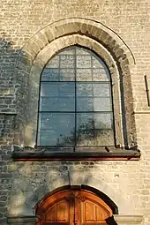 - celle de la face ouest a été remplacée en 1835 par un portail de style néo-classique en pierre bleue[2] dont les piédroits en pierre de taille à impostes de style toscan supportent un arc surbaissé à clé saillante, le tout surmonté d'une grande baie ogivale à double ébrasement ;