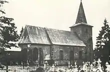 Ainsi, jusqu'au milieu du XXe, se trouvait - à l'emplacement du cimetière actuel - une église de style gothique, construite à partir du XIIe siècle et plusieurs fois agrandie et aménagée jusqu'au XVIIIe. L'édifice était simple, avec une vaste nef accolée à un clocher massif (XIIe siècle). L'entrée principale se situait latéralement par rapport à son axe.