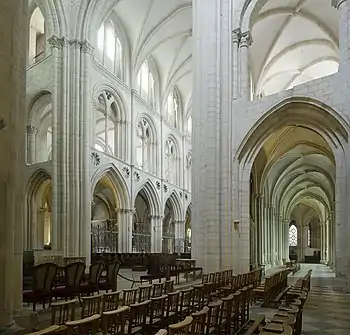 Dans la nef, les piliers forts et faibles se concilient mal avec des voûtes d'arêtes mais s'accordent très bien avec des voûtes sexpartites sur croisée d'ogives. Ce projet change complètement l'aspect du triforium dont il reste toutes les constructions antérieures dans la nef sauf une colonne par travée.