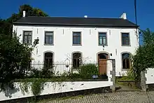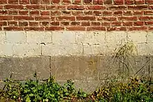 Les façades possèdent un soubassement composé de deux assises de blocs de pierre bleue surmontées de deux assises de blocs de grès.