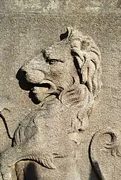 Le piédestal de ce monument est orné d'un blason flanqué d'un griffon (mi-aigle et mi-lion) et d'un lion, et surmonté d'un heaume[P 23].