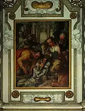 La nef est surmontée d'un plafond plat qui se prolonge jusqu'au chœur. Ce plafond est délimité en plusieurs compartiments par des moulures. Son compartiment central est orné d'un décor en stuc constitué d'une triple moulure octogonale encadrant une rosette de feuillages.