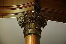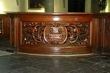 Le fond de la nef est occupé par la tribune d'orgues, ornée d'une balustrade en chêne et supportée par deux colonnes en chêne aux chapiteaux composites (combinaison de chapiteau ionique et de chapiteau corinthien).